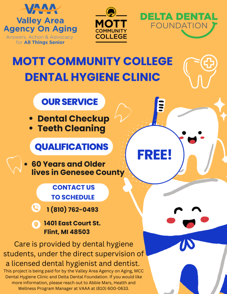 Through a partnership with Mott Community College Dental Hygiene Clinic, oral cleanings are provided to seniors in need.
